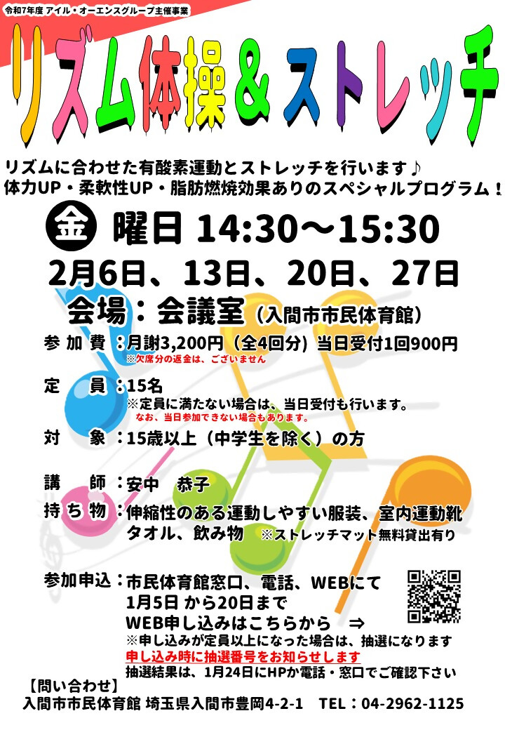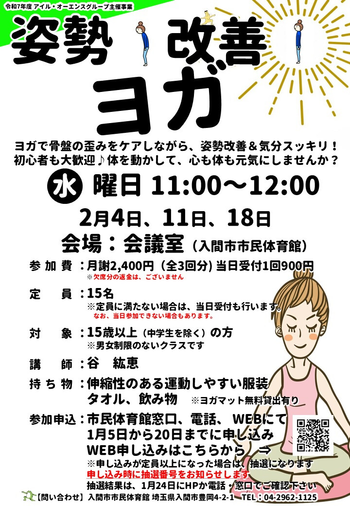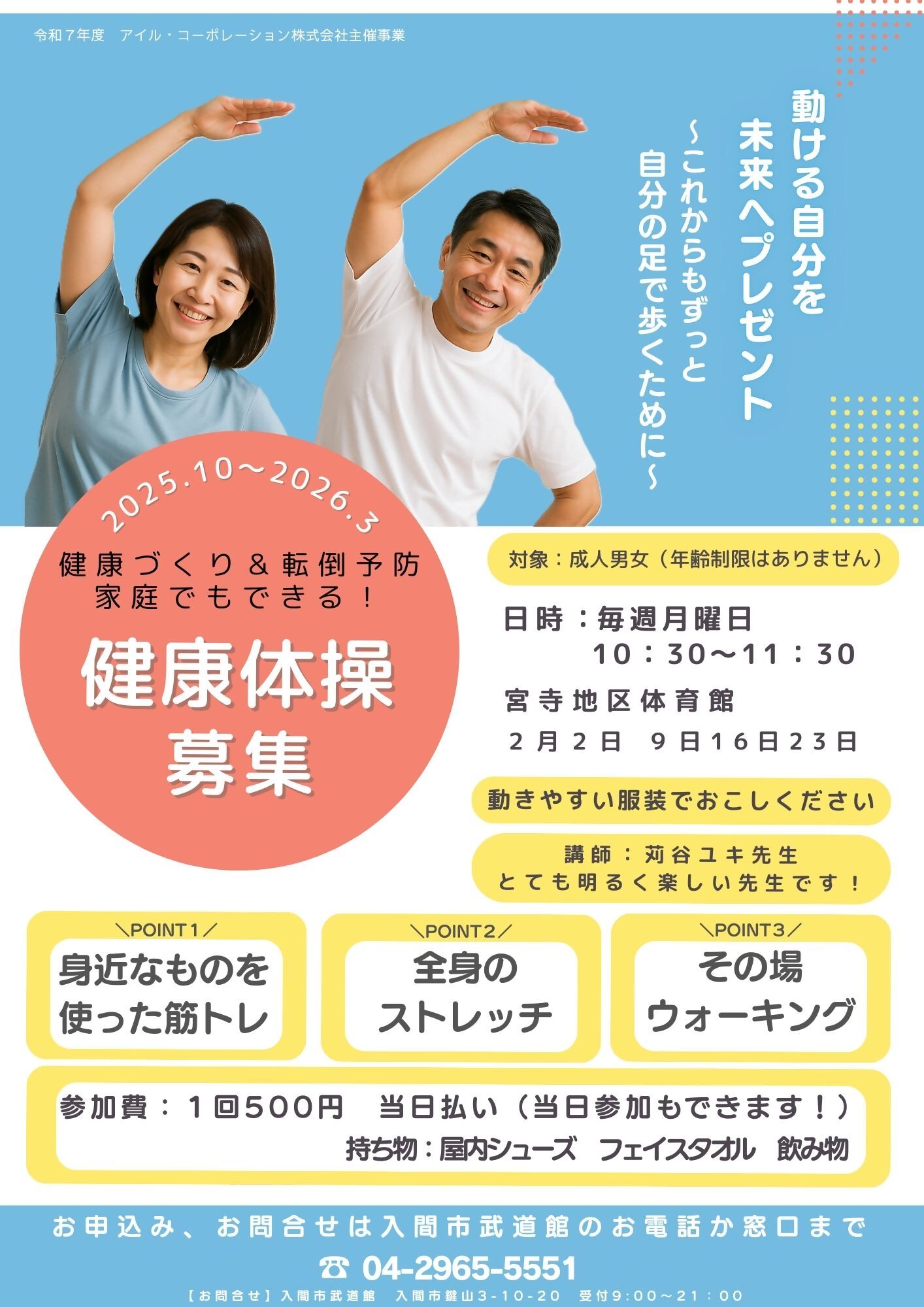 入間市市民体育館、武道館、地区体育館では、ヨガや健康体操など様々な運動教室・イベントを行っています。初心者の方も大歓迎です!