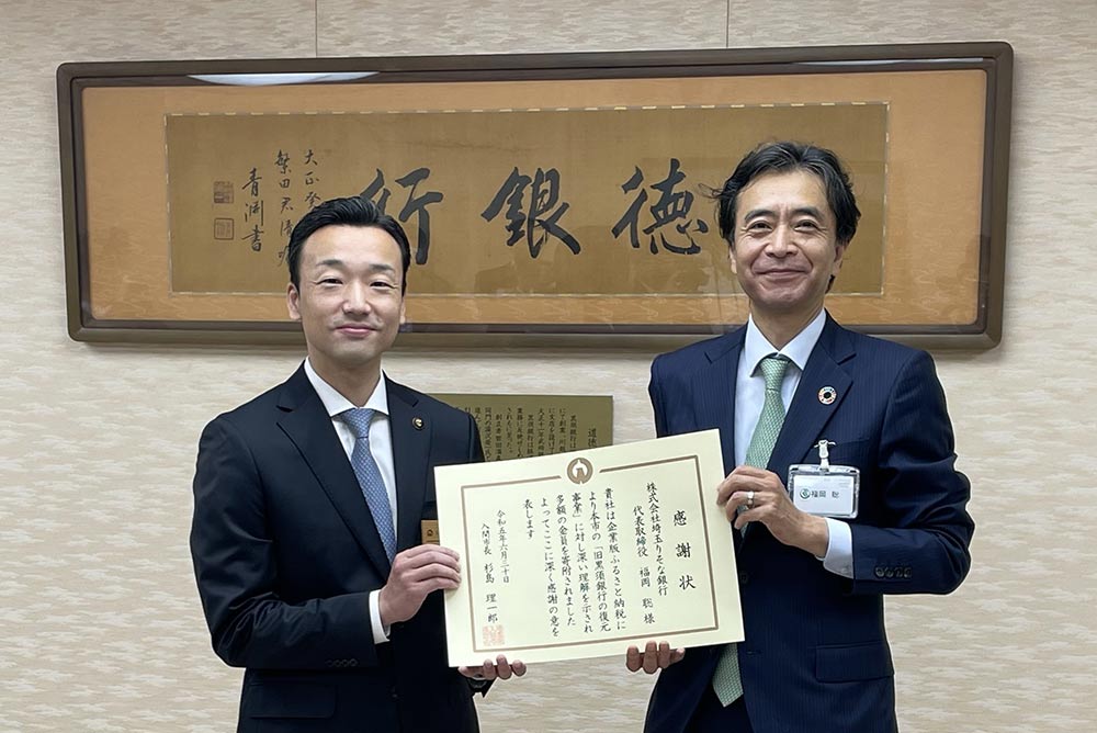 本市における、受入第1号として企業版ふるさと納税を活用した寄附をいただき、令和5年6月30日(金曜)に、株式会社埼玉りそな銀行本店(さいたま市浦和区)にて感謝状贈呈式を開催いたしました。