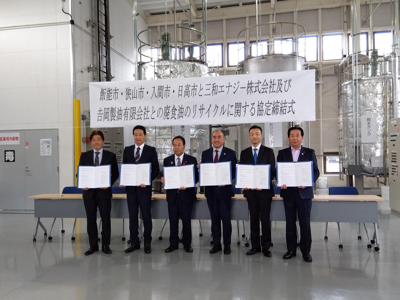 10月10日、飯能市・狭山市・入間市・日高市と三和エナジー株式会社及び𠮷岡製油有限会社との廃食油のリサイクルに関する連携協定締結式を三和エナジー株式会社新狭山バイオプラントにて執り行いました。本協定の締結によって、各地域の給食センターや保育所から排出される廃食油を𠮷岡製油株式会社様にて回収、三和エナジー株式会社様の新狭山バイオプラントでバイオディーゼル燃料にリサイクルいただきます。このリサイクルされた燃料は今後、公用車等で活用していく予定で、入間市を含めた広域での循環型社会の形成に取り組み、カーボンニュートラルとサーキュラーエコノミーの推進を目指してまいります。