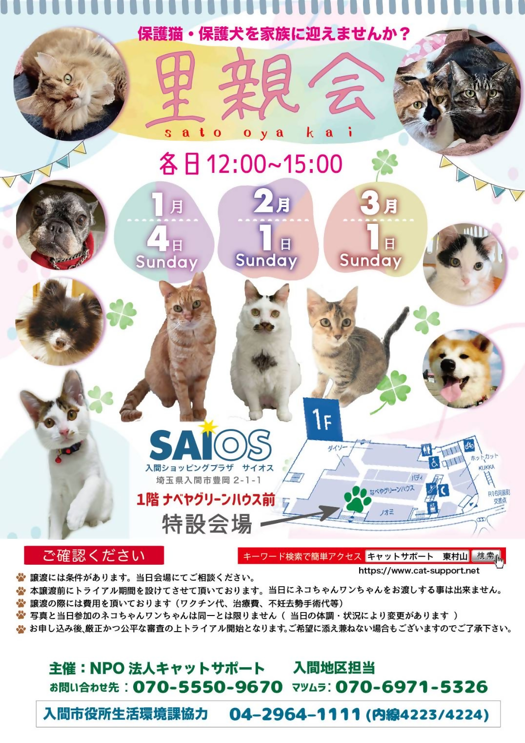 保護猫啓蒙活動を積極的に推進している「NPO法人 キャットサポート」が主催する「保護猫・保護犬里親会」を入間市協力の下、入間ショッピングプラザ サイオスで開催しています!是非お越しください!
